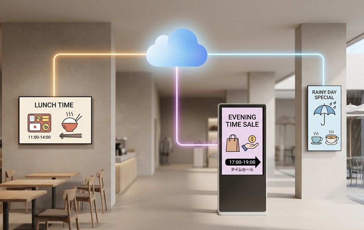 「ランチタイム」「夕方のタイムセール」など、時間帯や天候に合わせたコンテンツの切り替えが本部一括操作で完結します。