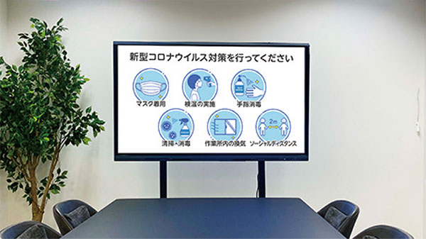 会議での打ち合わせ事項の共有のほか、今週の標語や安全確認事項、ポスターやその他書類のデジタル表示など、デジタルサイネージとして幅広く活用が可能です。65インチ以上の大型ディスプレイのため周知効果も抜群です。